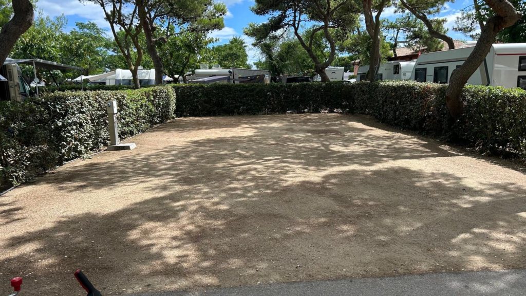 Ein eigener Strom- und Wasseranschluss ist vorhanden. Der Boden besteht aus einer Mischung aus Steinen, Sand und Erde, was sehr fest ist, aber in trockenen Perioden etwas staubt. Die Parzellen sind durch Hecken getrennt, die Windschutz bieten und gleichzeitig Privatsphäre gewährleisten. In den Hecken stehen auch Pinien, perfekt, um Hängematten, Wäscheleinen oder Lichterketten aufzuhängen.
