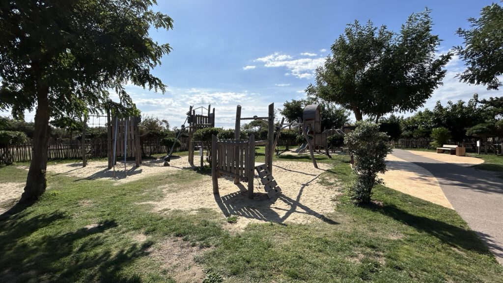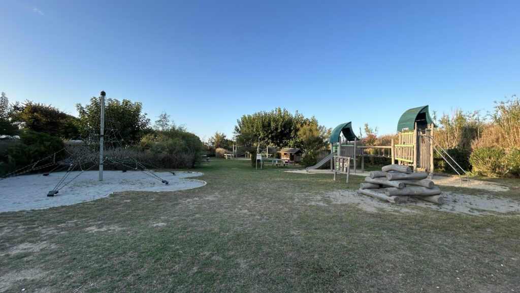 Mehrere Spielplätze sind über den Platz verteilt. Ein älterer Spielplatz liegt am Hundestrand, ausgestattet mit Klettergerüst, Schaukeln, kleinen Häuschen und Tischtennisplatten. Ein moderner Spielplatz hinter dem Restaurant bietet Kletter- und Spielgeräte für Kinder von 0–12 Jahren.